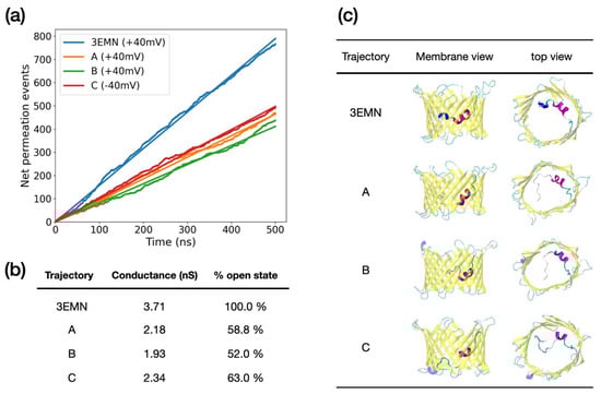 By running unbiased MD, we identified a total of 3 conformers whose trajectory was characterized by a stable low conductance over 500 ns ( and ). These included two conformers sampled at +40 mV, referred to as A and B, and one sampled at −40 mV, referred to as C. In Figure 4a, we showed the total number of ion permeation events recorded for these structures, as well as for 3EMN used here as a reference. To be consistent with our original sampling, the voltage was set to +40 mV for conformers initially generated at +40 mV and to −40 mV for conformers generated at −40 mV. Estimated conductances are displayed in Figure 4b. Importantly, conductances of conformers A, B and C were in line with experimental values for closed states, which are expected to lie within an interval of 40–60% of the conductance in the open state [36]. Finally, the average (representative) structure of each MD trajectory was depicted in Figure 4c. Structures of subconducting trajectories all featured an unfolded region of the N-terminus obstructing the middle of the pore in the xy-plane, i.e., the plane parallel to the membrane. Important differences were also observed between the +40 mV and −40 mV cases: at +40 mV, the unfolded domain corresponded to the M1-G11 segment, which passed through the center of the barrel along the z-axis, i.e., the pore axis. Meanwhile, at −40 mV, the unfolded segment also included residues up to A14 and essentially occluded the bottom part of the barrel along the z-axis.