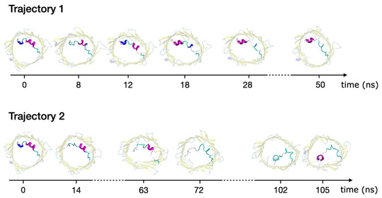 In search of other possible structures explaining VDAC closed states, we also identified a few aMD trajectories whereby the N-terminal tail was able to unfold and refold into a helical pattern different from that of the crystal structure. This was observed for two trajectories: the first one (trajectory 1) was extracted from aMD at +40 mV (conformational landscape provided in Figure 2), while the second one (trajectory 2) was obtained from short additional aMD using a stronger biasing potential to guarantee complete unfolding of the N-terminus. Both trajectories are displayed in Figure 6, starting from the 3EMN crystal structure and ending at the conformer with refolded N-terminus. Trajectory 1 was characterized by the refolding of the Y7-D9 310-helix into a long α-helix, including residues L10 to K12. Such a transition goes along with the loss of helical structure for residues K12 to T19. Notably, the refolded structure had residues Y7 to D9 positioned similarly to the crystal structure (RMSD = 0.66 Å), which also explained the PC coordinates used to plot Figure 2, which account for large movements of the N-terminus, could not properly highlight this new state. Alternatively, Trajectory 2 involved the detachment of residues Y7-R15 from the barrel and subsequent unfolding of the long helix. Subsequently, residues Y7 to D9 were found to refold into a new α-helical structure via the interaction with barrel residues located on the wall opposite to where the N-terminus was initially positioned (H-bonds with E59, R63 and K96).