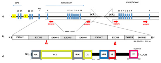 - Fusco, F.; Bardaro, T.; Fimiani, G.; Mercadante, V.; Miano, M.G.; Falco, G.; Israël, A.; Courtois, G.; D’Urso, M.; Ursini, M.V. Molecular analysis of the genetic defect in a large cohort of IP patients and identification of novel NEMO mutations interfering with NF-kappaB activation. Hum. Mol. Genet. 2004, 13, 1763–1773. [Google Scholar] [CrossRef]