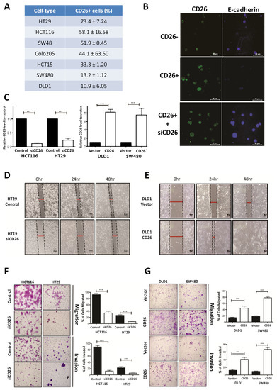CD26 functionally induces cell migration and invasion in colorectal cancer (CRC) cells. (A) Percentage of CD26+ cells in different CRC cell lines. (B) Immunofluorensce showing level of CD26 (green) and E-cadherin (blue) in HCT116 fluorescence-activated cell sorting (FACS)-sorted CD26-, CD26+ and CD26+ cells with CD26-siRNA (siCD26) transfected. CD26+ cells showed lower E-cadherin in comparison to CD26− cells, indicating induced EMT in CD26+ cells, whereas such effect was abrogated by transient repression of CD26 by siRNA (siCD26). The scale bars correspond to 40 µm. (C) Relative CD26 level in (left) CD26-siRNA transfected HCT116 and HT29 cells when compared to control transfected cells and (right) CD26 overexpressed DLD1 and SW480 cells when compared to vector control cells. (D) HT29 cells with transient CD26 knock-down by siRNA (siCD26) showed decreased wound-healing ability compared to siRNA-control transfected cells (control). The scale bars correspond to 200 µm. (E) DLD1 cells with transient CD26 overexpression (CD26) showed increased wound-healing ability compared to vector control (vector). (F) HCT116 and HT29 cells with transient CD26 knock-down by siRNA (siCD26) showed decreased migration and invasion ability compared to control-treated cells (control). The scale bars correspond to 200 µm. (G) DLD1 and SW480 cells with transient CD26 overexpression (CD26) showed increased migration and invasion ability compared to vector control (vector). *** denotes p < 0.0001.