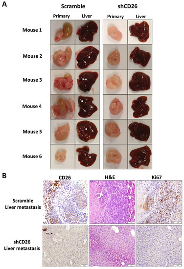 CD26 knock-down impairs CRC metastasis in mouse model. (A) HT29 cells with CD26 stably knock-down by retroviral-based method (shCD26) showed reduced ability to form metastatic liver nodules in immunodeficient mice when compared with the scramble group. White arrows indicate a potential tumor nodule on the liver. (B) Representative picture showing CD26 (left) level in liver metastasis of shCD26 and scramble groups. H&E (middle) and anti-human Ki67 (right) staining confirmed presence of liver metastasis. The scale bars correspond to 1 mm.