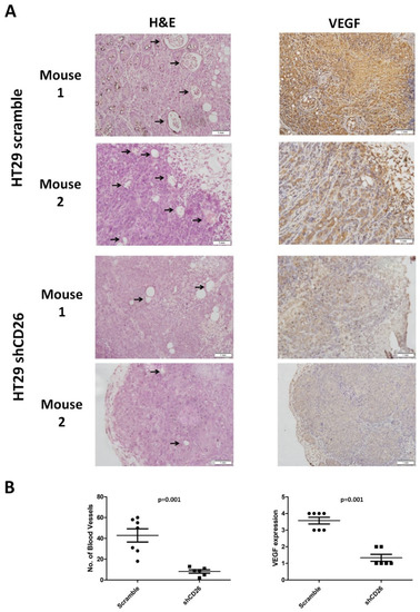 Furthermore, to evaluate the effect of CD26 on angiogenesis in a CRC tumor, we measured the number of blood vessels in the primary tumor from the shCD26 group and the scramble control group. The total number of blood vessels was determined in H&E-stained sections in 8 random fields in high-power microscopic fields (×40) by counting vascular structures based on typical morphological appearance and the presence of the counted vascular lumen and intraluminal red blood cells (indicated by arrows). The number of blood vessels was significantly reduced in shCD26 group when compared to scramble control group (Figure 3A,B). In addition, the expression of VEGF which is an important signaling protein involved in both vasculogenesis and angiogenesis was also significantly reduced in the shCD26 group (Figure 3A,B). These results demonstrated that CD26 repression impaired angiogenesis in CRC.