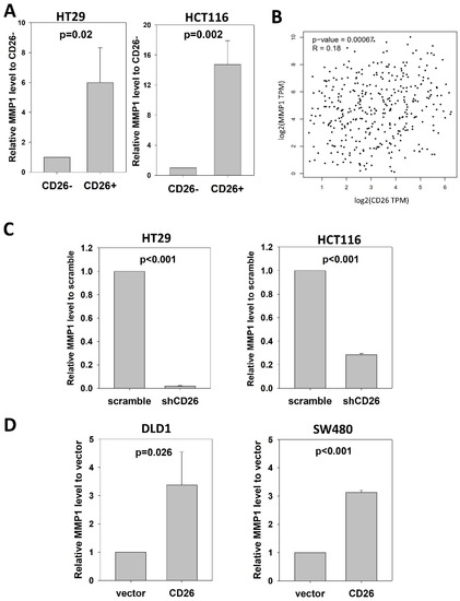CD26 regulates MMP1 expression in CRC cells. (A) Relative MMP1 level in CD26− and CD26+ cells of HT29 and HCT116 cell lines. (B) CD26 level was positive correlated with MMP1 in CRC specimens from TCGA database. (C) Stable CD26-repressed cells (shCD26) of HT29 and HCT116 showed lower MMP1 level. (D) Stable CD26-overexpressed cells of DLD1 and SW480 showed higher MMP1 level.