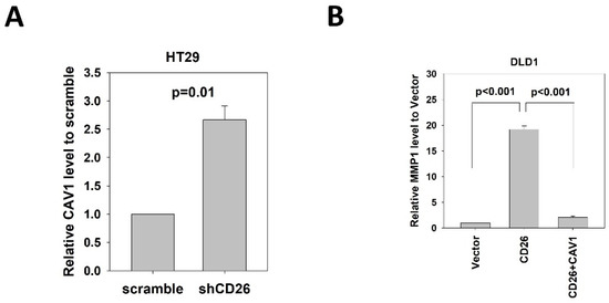 CAV1 has been reported to negatively regulate the expression of MMP1 [14]. Our mRNA expression array demonstrated lower CAV1 level in FACS-sorted CD26+ HT29 and HCT116 cells when compared to the CD26− counterparts (Table S1). In addition, our qPCR results showed that CAV1 was up-regulated in the HT29-shCD26 cells when compared to the scramble control cells (Figure 5A), indicating that CD26 functionally repressed the level of CAV1. Hence, we hypothesized CD26 regulated MMP1 level via CAV1. In line with our hypothesis, transient overexpression of CAV1 in DLD1 stable CD26 cells abrogated the MMP1 induction effect by CD26 overexpression (Figure 5B).