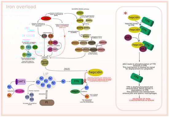 | (i) | Vitamin A deficiency additionally stimulates gene Hamp expression by increase of IL-6 and IL-1. |