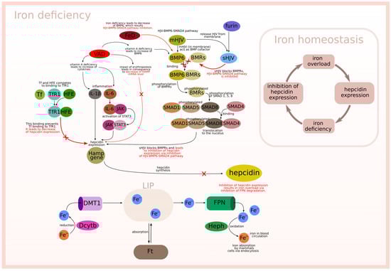 | (s) | Low iron level and vitamin A deficiency lead to decrease of BMP6, which results in inhibition of HJV-BMP6-SMAD4 pathway. |