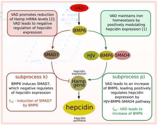 - VAD and low iron level leads to decrease of BMP6, which results in inhibition of hepcidin expression (subprocess (s) included in 12 t-clusters).
