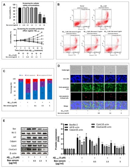 Bee venom protected HT22 cells against Aβ1–42 induced apoptosis (A) Experiments screened for cellular safety concentration and possible protective effect against Aβ1–42-stress induced in HT22 cells. First experiment—screening for bee venom cellular safety. The results indicate that 5 μg/mL was the highest concentration that did not significantly alter HT22 cell availability after 24 h of incubation (bee venom was pre-treated and cell viability was examined after 24 h). For protective effects of bee venom against Aβ1–42 stress. The results indicate that 0.5–5 μg/mL bee venom dose-dependently ameliorated HT22 cell availability (bee venom was introduced 1 h before 5 μM Aβ1–42 challenge, cell availability was examined every 4 h for one day). (B) Apoptosis-inhibitory effects of bee venom on Aβ1–42 induced HT-22 cells by flow cytometry analysis with (C) summarized statistics results. The results indicate that 0.5 to 5 μg/mL of bee venom dose-dependently ameliorated HT22 cell apoptosis under Aβ1–42 (5 μM) stress-induced conditions (8 h after Aβ1–42 (5 μM) challenge, cells underwent immunofluorescence staining, and cyto flowmetery analysis was carried out). (D) Fluorescence microscopy analysis of the apoptosis level of cells from different treatment groups, an imaging supplement to parts (B,C) (8 h after Aβ1–42 (5 μM) challenge, cells underwent immunofluorescence staining and analysis). (E) Western blot analysis of key apoptosis proteins. The results indicate that bee venom (0.5–5) μg/mL dose-dependently stabilized the expression of pro- and anti-apoptosis proteins under Aβ1–42 stress challenge (8 h after Aβ1–42 (5 μM) challenge, cells were lysed, and Western blot was performed). Data are shown as mean ± SD in triplicate. # p < 0.01 vs. control; * p < 0.05 or ** p < 0.01 vs. Aβ1–42 only-treated group.