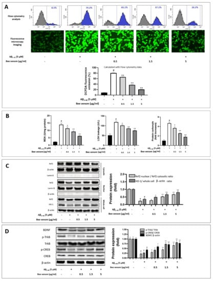 Bee venom upregulates Nrf2/HO-1 and BDNF/TrkB/CREB pathways in HT22 cell in Aβ1–42 induced stress (A) Flow cytometry and fluorescence microscopy imaging analysis to determine cellular ROS levels, and summarized statistics results calculated with flow cytometry data. The results indicated that bee venom (0.5–5 μg/mL) dose-dependently normalized the expression of oxidative stress under Aβ1–42 challenge (8 h after Aβ1–42 (5 μM) challenge, immunofluorescence analysis by DCFDA staining was performed). (B) Assay results of MDA, LDH, and protein carbonyls levels. The results indicate that bee venom (0.5–5 μg/mL) dose-dependently downregulated MDA, LDH, and protein carbonyl parameters under Aβ1–42 stress challenge (8 h after Aβ1–42 (5 μM) challenge, measuring kits for MDA, LDH, and protein carbonyls were applied to determine the parameters). (C) Effect of bee venom on nuclear translocation of Nrf2 and production of HO-1 antioxidant enzyme. The results suggest that bee venom (0.5–5 μg/mL) dose-dependently enhanced Nrf2 nuclear translocation and increased the expression of the antioxidant enzyme HO-1 in HT22 cells under Aβ1–42 (5 μM) challenge (8 h after Aβ1–42 (5 μM) challenge, whole-cell, cytosolic, and nuclear proteins were obtained, and Western blot was conducted). (D) Effects of bee venom on the activation of brain-derived neurotrophic factor signaling. The results suggest that bee venom enhanced the performance of the BDNF/TrkB/CREB pathway during Aβ1–42 (5 μM) challenge (8 h after Aβ1–42 (5 μM) challenge, cells were lysed, and Western blot was performed). Data are shown as mean ± SD in triplicate. # p < 0.01 vs. control; * p < 0.05 or ** p < 0.01 vs. Aβ1–42 only-treated group.
