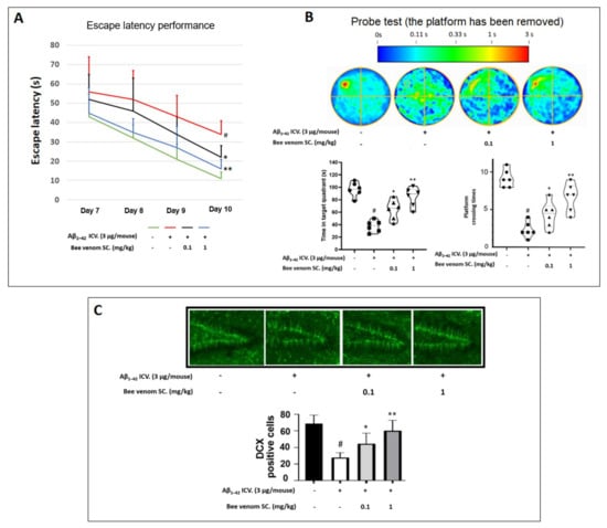 Bee venom recovers animal cognitive function and hippocampal neuronal development depleted by Aβ1–42 ICV pre-treatment (A) Protective effects of bee venom on memory in Aβ1–42 -treated mice studied in a Morris water maze experiment. Two tests (A,B) exhibited a decrease in learning and memory performance when induced with Aβ1–42 ICV, and bee venom (0.1–1 mg/kg) significantly reversed this cognitive dysfunction. (A) Animal escape latency performance on days 7 to 10. To conduct this experiment, mice were administered bee venom (0.1 or 1 mg/kg SC) after Aβ1–42 treatment (5 μg/mouse, ICV), an adaptive training was conducted on day 6, and the escape training test was performed on days 7 to 10. (B) A probe test was conducted at the end of day 10 to bolster behavior assessments (the platform was removed, and mice were allowed to swim freely for 120 s to ascertain their remembrance of the disappeared platform location). A color scale denotes the average allocation position of animals in each group. The circle positioned in the upper-left quadrant is the removed platform location. (C) Protective effects of bee venom on neuronal cells in the dentate gyrus region against Aβ1–42 induced stress. The results indicate that Aβ1–42 ICV treatment reduced neuron neurogenesis significantly, and this was drastically reversed by bee venom (brain sections were stained with doublecortin protein antibody, and the same areas of hippocampal dentate gyrus region were observed under a fluorescence microscope). Data are shown as mean ± SD in triplicate. # p < 0.01 vs. control; * p < 0.05 or ** p < 0.01 vs. Aβ1–42-only-treated group.