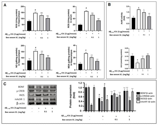 Bee venom regains mouse hippocampus biochemiscal stability of Aβ1–42 ICV pre-treatment mice (A) Major antioxidant parameters ROS, NO, and MDA were examined in in vivo samples: The results show that Aβ1–42 ICV treatment significantly increased oxidative stress in the hippocampus and serum, which was reversed by bee venom treatment (hippocampus extract and serum were prepared, and ROS, NO, and MDA levels were examined with respective measuring kits instructions). (B) Levels of AchE activity and Ach content in the mouse hippocampal. The cholinergic system exhibited amelioration against Aβ1–42 ICV-induced neurodegeneration as bee venom was administered (hippocampus extract were prepared, AchE and Ach levels were examined with respective measuring kits instructions). (C) Levels of BDNF, p-CREB, iNOS, and mAchR1 protein expression in mouse hippocampus. Bee venom dose-dependently exhibited protective effects against Aβ1–42-induced neuro-imbalance in vivo (Western blot analyses were conducted on protein extracts from hippocampal tissue). Data are shown as mean ± SD in triplicate. # p < 0.01 vs. control; * p < 0.05 or ** p < 0.01 vs. Aβ1–42-only-treated group.