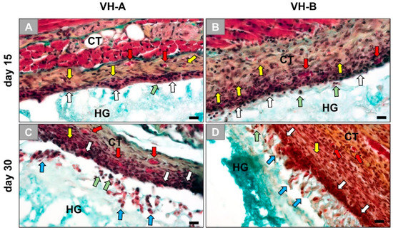 Exemplary histological images of the subcutaneously implanted hydrogels (VH-A and VH-B) at day 15 and 30 post implantation. (A) VH-A hydrogel and (B) VH-B hydrogel at day 15. (C) VH-A hydrogel and (D) VH-B hydrogel at day 30. CT = connective tissue, HG = hydrogel, white arrows = macrophages, green arrows = neutrophils, yellow arrows = eosinophils, red arrows = blood vessels and blue arrows = infiltration cells of the reactive tissue (Movat Pentachrome stainings, magnification = 400×, scalebars = 20 µm).