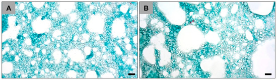 Exemplary microscopic images of the vaterite-loaded hydrogels in vivo within the implant bed centers at day 15 post implantation. (A) VH-A hydrogel. (B) VH-B hydrogel. (Movat Pentachrome stainings, magnification = 400×, and scalebars = 20 µm).