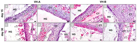 Immunohistochemical detection of pro- and anti-inflammatory macrophage subtypes at 15 and 30 days post implantation. (A) VH-A hydrogel at day 15, M1 immunostaining. (B) VH-A hydrogel at day 15, M2 immunostaining. (C) VH-B hydrogel at day 15, M1 immunostaining. (D) VH-B hydrogel at day 15, M2 immunohistochemical staining. (E) VH-A hydrogel at day 30, M1 immunostaining. (F) VH-A hydrogel at day 30, M2 immunostaining. (G) VH-B hydrogel at day 30, M1 immunostaining. (H) VH-B hydrogel at day 30, M2 immunostaining. White arrows: immunohistochemically stained macrophages, HG: hydrogel, CT: connective tissue (CD11c and CD163 immunostainings, magnification = 400×, scalebars = 20 µm).