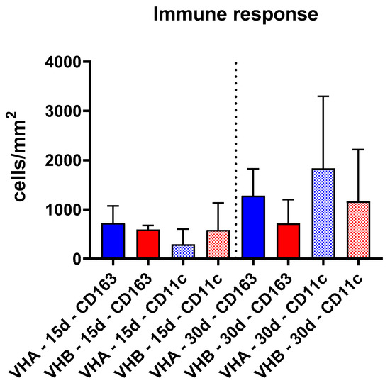 The quantitative analysis of pro- and anti-inflammatory macrophages within the implantation beds of the biomaterials showed that the number of CD163-positive M2 cells at day 15 post implantation was 726.2 ± 345.2 cells/mm2 and 593.4 ± 83.83 cells/mm2 for the VH-A and VH-B hydrogels, respectively (Figure 4). CD11c-positive M1 cells were present at 292.3 ± 311.9 cells/mm2 and 584.8 ± 549.5 cells/mm2 for the VH-A and VH-B hydrogels, respectively, at day 15 post implantation (Figure 4).