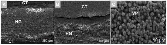 Exemplary SEM images from the VH-B group at day 30 post implantation. (A) Vaterite-loaded hydrogel (HG) within the subcutaneous connective tissue (CT) (magnification = 200×, scalebar = 250 µm). (B) Image from the hydrogel (HG)–tissue interface (magnification = 500×, scalebar = 100 µm). (C) Vaterite particles (VP) within the hydrogel region (magnification = 5000×, scalebar = 10 µm).
