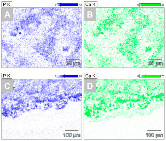 Exemplary SEM-EDX visualization of calcium (Ca) and phosphate (P) within the VH-A implantation beds at day 30 post implantation. (A) and (C) Phosphate presence, (B) and (D) calcium presence within the region of the implanted hydrogel up to the borders of the implantation beds (magnifications = 500×, scalebars = 100 µm).