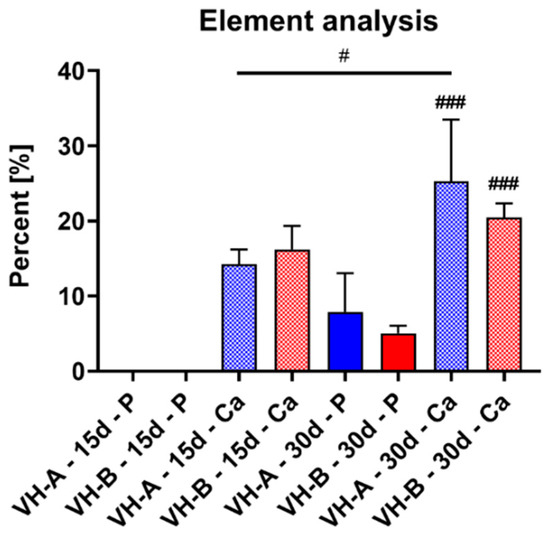 The quantitative element analysis also showed that phosphate was not detected in the implantation beds of both study groups at day 15. However, at 30 days post implantation both calcium and phosphate were found in the implantation beds (Figure 7). Thereby, no significant differences were found analyzing the amounts of both calcium and phosphate in either of the materials containing vaterite at both time points (Figure 7). However, the measurements revealed that the calcium percentage was significantly higher than phosphate (### p ≤ 0.001) for both groups at day 30 post implantation (Figure 7). In addition, the percentage of calcium appeared to increase from day 15 to day 30 in both hydrogel groups but was only significant for the VH-A materials (# p < 0.05) (Figure 7).