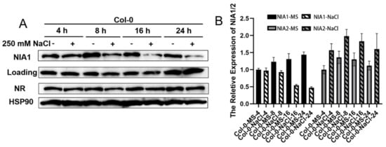 2.3. Single Mutation of NIA1 or NIA2 Shows a Similar Phenotype under Long-Term NaCl Stress