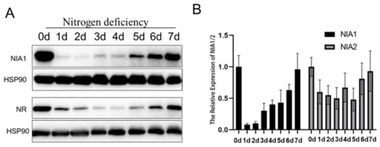 2.4. Nitrogen Deficiency Stress Also Dynamically Downregulates Both NIA1 and NIA2 in the Transcriptional Level