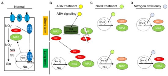 - Zhao, C.; Cai, S.; Wang, Y.; Chen, Z.H. Loss of nitrate reductases NIA1 and NIA2 impairs stomatal closure by altering genes of core aba signaling components in Arabidopsis. Plant Signal. Behav. 2016, 11, 1456–1469. [Google Scholar] [CrossRef]