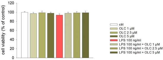To exclude any cytotoxic effect of OLC on THP-1-derived macrophages and to establish its non-lethal concentrations, preliminary experiments were performed using the 1-(4,5-dimethylthiazol-2-yl)-3,5-diphenylformazan (MTT) test. The results of this assay shown that pre-treatment of THP-1-derived macrophages with different concentrations of OLC (1–50 µM) for 30 min prior the exposure to LPS for 24 h did not hamper cell viability up to 5 µM (Figure 1) in presence or absence of LPS. However, cell viability significantly decreased from 10 to 50 μM (data not shown). These results indicate that OLC is non-toxic up to 5 µM, and hence, these concentrations were used for further experiments.