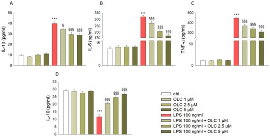 OLC reduced the release of IL-1β, IL-6 and TNF-α and enhanced that of IL-10 in LPS-stimulated THP-1-derived macrophages. The cells were treated with increasing concentrations of OLC (1, 2.5 and 5 μM) for 30 min prior LPS (100 ng/mL) for 24 h. Then, secretion of IL-1β (A), IL-6 (B), TNF-α (C) and IL-10 (D) in the cultured medium was evaluated by ELISA assay. Data are the mean ± SEM of three independent experiments performed in triplicate. *** p < 0.001 vs. ctrl; § p < 0.05 vs. LPS-treated cells; §§§ p < 0.001 vs. LPS-treated cells.