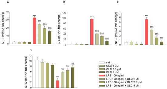 Effects of OLC on cytokine gene expression in THP-1-derived macrophages stimulated with LPS. THP-1 cells were treated with different concentrations of OLC (1, 2.5 and 5 μM) for 30 min prior LPS (100 ng/mL) for 24 h. The results from real-time PCR of IL-1β (A), IL-6 (B), TNF- α (C) and IL-10 (D) are expressed as a relative fold change compared to untreated cells, after normalization against β-actin as endogenous control. Data are the mean ± SEM of three independent experiments performed in triplicate. *** p < 0.001 vs. ctrl; §§ p < 0.01 vs. LPS-treated cells; §§§ p < 0.001 vs. LPS-treated cells.