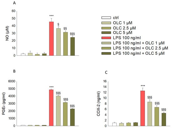 Effects of OLC in LPS-induced production of pro-inflammatory mediators in THP-1-derived macrophages. THP-1-derived macrophages were treated with different concentrations of OLC (1, 2.5 and 5 μM) for 30 min prior LPS (100 ng/mL) for 24 h. The results from the Griess reaction of NO (A) and ELISA assay of PGE2 (B) and COX-2 (C) are shown. Data are the mean ± SEM of three independent experiments performed in triplicate. *** p < 0.001 vs. ctrl; § p < 0.05 vs. LPS-treated cells; §§ p < 0.01 vs. LPS-treated cells; §§§ p < 0.001 vs. LPS-treated cells.