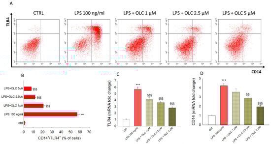 The significant stimulation of both CD14 and TLR4 expression induced by LPS in differentiated THP-1 cells was clear by the shift of cell population towards the upper-right quadrant of the dot plot respect unstimulated cells (Figure 5A). In detail, the 57 ± 3% of cells populate this quadrant after LPS exposure, an effect counteracted by the treatment with OLC at 1, 2.5 and 5 µM, which brought the percentages of cells in the upper-right quadrant to the 21 ± 1%, 12 ± 0.9% and 8 ± 0.2%, respectively, showing a down-regulation of both CD14 and TLR4 expression (Figure 5A,B). Figure 5C,D reflect that the expression levels of TLR4 (Figure 5C) and CD14 (Figure 5D) receptors in the LPS-treated THP-1-derived macrophages were dramatically increased (p < 0.001). This effect was hampered by pre-treatment with OLC at all the tested concentrations (p < 0.001 for TLR4; p < 0.01 and p < 0.001 for OLC 2.5 μM and 5 μM for the expression of CD14, respectively).