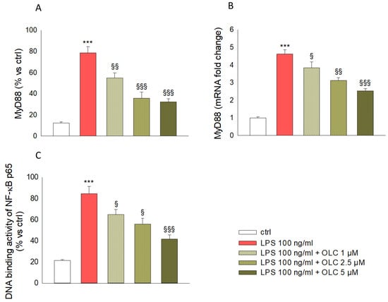 Modulation of LPS-induced activation of MyD88 and NF-κB in THP-1-derived macrophages by OLC. THP-1-derived macrophages were treated with different concentrations of OLC (1, 2.5 and 5 μM) for 30 min prior LPS (100 ng/mL) for 24 h. The results from MyD88 measured by ELISA assay (A) and real-time PCR (B) are shown along with results of DNA binding activity of NF-κB p65 (C) obtained by ELISA tests. Data are the mean ± SEM of three independent experiments performed in triplicate. *** p < 0.001 vs. ctrl; § p < 0.05 vs. LPS-treated cells; §§ p < 0.01 vs. LPS-treated cells; §§§ p < 0.001 vs. LPS-treated cells.