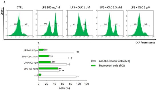 The exposure to LPS (100 ng/mL) of THP-1-derived macrophages brought a massive increase of intracellular ROS respect to untreated cells, as displayed by the extent of measured fluorescence (Figure 7). In particular, we observed that 48 ± 1.6% of cells showed augmented intracellular ROS after LPS exposure. Contrariwise, the pre-treatment with OLC at 1, 2.5 and 5 µM hampered the oxidant effect of the bacterial endotoxin; thus, the percentage of fluorescent cells were 30 ± 2%, 25 ± 0.5% and 12 ± 0.8%, respectively (Figure 7).