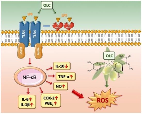In our experiments, THP-1-derived macrophages were seeded at a density of 5 × 105 cells/mL into culture plates in RPMI complete medium plus 10% FBS and incubated at 37 °C with LPS at 100 ng/mL concentration for 24 h, in the presence or absence of OLC, which was added to the culture medium 30 min prior to the LPS treatment.