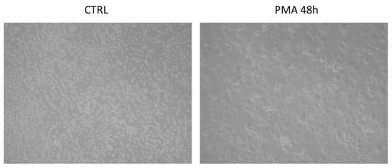 To induce differentiation of THP-1 cells into macrophage-like ones, monocytes were placed into six-well plates at a cell density of 2 × 105 cells/mL and treated with 100 ng/mL of phorbol 12-myristate 13-acetate (PMA) for 48 h [58]. After attachment on the bottom surface, PMA-contained medium was removed and THP-1 macrophages were subsequently cultivated for further 24 h in PMA-free culture medium prior starting the experiments. A representative image of THP-1 differentiated macrophages and undifferentiated are shown in Figure 9. Each cell culture reagent was from Gibco (Life Technologies, Monza, Italy). OLC and PMA were from Sigma (Milan, Italy), while LPS was from InvitroGen (San Diego, CA, USA).
