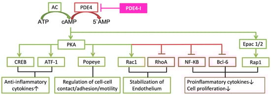 The two main signaling axes downstream of cAMP are the activation of protein kinase A (PKA) and exchange proteins directly activated by cAMP (Epac). These downstream cascades are included in pro- and anti-inflammatory cytokine release (see Figure 1) [9]. In addition, cAMP acts downstream by cyclic nucleotide-gated ion channels and the Popeye domain family [10,11,12,13]. The latter are involved in the regulation of epithelial cell-cell contact, where they regulate cell-cell adhesion and motility, especially in cancer (for details see [12]). Cyclic nucleotide-gated ion channels can be activated by cyclic AMP, which results in their opening and to cAMP-induced calcium influx in cells. Therefore, cAMP has pleiotropic effects via these channels in different cells. PKA, Epac 1/2 and cyclic nucleotide-gated ion channels are activated by elevated levels of cAMP [14,15]. When cAMP binds to PKA, PKA releases the catalytic PKA subunits to phosphorylate many targets. One of these targets is the cyclic AMP response element-binding protein (CREB), which acts as a transcription factor to cAMP response element (CRE) [16]. If CREB is activated and CREB-binding protein is recruited, the transcription of the target gene is initiated [16]. In addition, ATF-1 (cAMP-dependent activating transcription factor 1) is regulated by cAMP and PKA [17]. These two axes of transcription are involved in the upregulation of anti-inflammatory cytokines. The stabilization of the endothelium is driven by PKA-dependent signaling leading to activation of the small GTPase Rac1 (Ras-related C3 botulinum toxin substrate 1), which is paralleled by RhoA (Ras homolog family member A) inactivation (see Section 2.5). Another target of PKA is NF-κB (nuclear factor ‘kappa-light-chain-enhancer’ of activated B-cells), which induces inflammatory gene expression, such as IL-1ß, IL-6 or TNF-α. The cyclic AMP/PKA cascade inhibits NF-κB in most cell types and therefore reduces proinflammatory cytokine [4].Cell proliferation as well as proinflammatory cytokines can be induced by Bcl-6 (B-cell lymphoma 6 protein). PKA can inhibit Bcl-6 via ERK 1/2 [18]. Decrease of inflammatory gene transcription can also be regulated with cAMP by Epac 1/2, which activates the transcription protein Rap 1 (Ras-related protein 1).