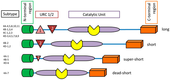 PDE4 has four subtypes (A, B, C and D). These subtypes are encoded on separate genes. Each subgroup has an additional 3–11 different isoforms, which have a unique N-terminal end (Figure 2). The N-terminal end can further be classified into the following groups: dead-short, super-short, short, and long-form. The upstream conserved region (UCR) exists in two variants (UCR1 and UCR2). The UCR clusters UCR1 and 2 are only located on the long-form of PDE4 variants [3,19], and the short-form contains UCR2 and the super-short truncated UCR2 [3]. UCR1/2 have a key regulatory function of the catalytic unit of PDE4. UCR1 has a phosphorylation site of cAMP-dependent protein kinase A (PKA) and UCR2 may have an inhibitory effect on the PDE4 catalytic unit and interact with UCR1 [20]. Therefore, the different UCR1/2 regions and distribution have a regulatory pattern for PDE4 subfamilies. Only PDE4B, C and D have the extracellular signal-regulated kinase (ERK)-phosphorylation subunits, which are inserted in the catalytic PDE4 unit. The phosphorylation of the ERK-units inhibits hydrolytic activity of the long PDE4 form, has weak or no effect on the super-short form and can increase hydrolytic activity of the short PDE4 form.