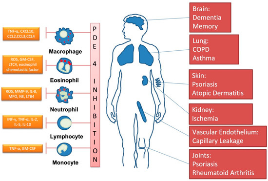 Many organs, including the immune system, and diseases can be targeted by PDE4-inhibitors, as summarized in Figure 3.