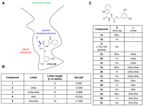 (A) Schematic representation of the L732,138 binding model that guided the design. (B) The linkers chosen along with their lengths and their predicted effect on lipophilicity expressed as the change of theoretical lipophilicity parameter (ΔALogP). (C) The analogues to be synthesized. Abbreviations: Ac—acetyl, Ahx—ε-aminohexanoic acid, Boc—tert-butoxycarbonyl, DAla—D-alanine.