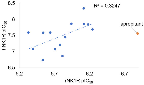 Plot of the hNK1R versus rNK1R binding affinity for compounds 1a–5c. The affinities are shown as the negative logarithm of the IC50 value (pIC50). Compound 1b is excluded for having indeterminate rNK1R affinity (IC50 > 10 μM). The data for aprepitant are given for reference.