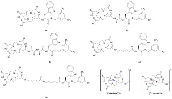 Structures of all DOTA conjugates, 1d–5d, along with [68Ga]Ga-DOTA- and [177Lu]Lu-DOTA-radiocomplexes present in [68Ga]Ga-1d–[68Ga]Ga-5d and [177Lu]Lu-1d–[177Lu]Lu-5d radioconjugates.