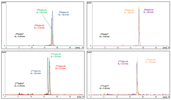 In parallel, the verification of the obtained 68Ga-radioconjugates was performed by synthesis of the non-radioactive stable gallium reference compounds (Ga-1d–Ga-5d). These were prepared in an analogous manner, as in the case of 68Ga-radioconjugates, followed by the characterization using mass spectrometry. The comparison of HPLC retention times (tR) of radioactive and non-radioactive products is presented in Table 2. The values are consistent, corroborating the identity of the conjugates (the differences between them result from the serial connection of UV-Vis and gamma detectors).