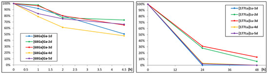 Percentage of intact 68Ga-radioconjugates (left) and 177Lu-radioconjugates (right) determined at specific time points during incubation in human serum.
