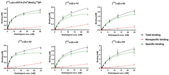 The analogues labelled with 177Lu were assayed for the receptor affinity in saturation binding experiments. For comparative purposes, we have also evaluated a well-known 177Lu-radioconjugate of Substance P derivative, i.e., [177Lu]Lu-DOTA-[Thi8,Met(O2)11]SP. This very SP derivative is a currently used vector for an α therapy of glioblastoma multiforme [11,24]. The binding parameters are summarized in Table 5, while the illustrative binding profiles are presented in Figure 6.