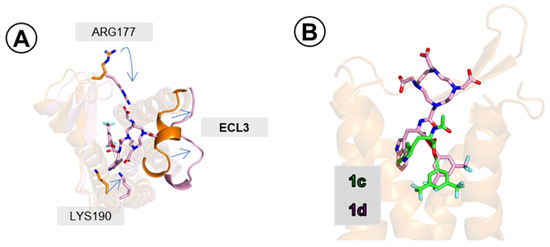 Compound 1d (pink sticks) in the hNK1 binding site. (A) Readjustments of ECL3 and of side-chains of Arg177 and Lys190. In orange are the positions as found in simulation 1c-1, in pink are the positions as found in simulation 1d-1 (final snapshots). (B) Binding pose of 1d (pink) superposed on that of 1c (green). Poses taken from final snapshot of 1c-1 and 1d-1 simulations. Only a few receptor (orange) helices are shown.