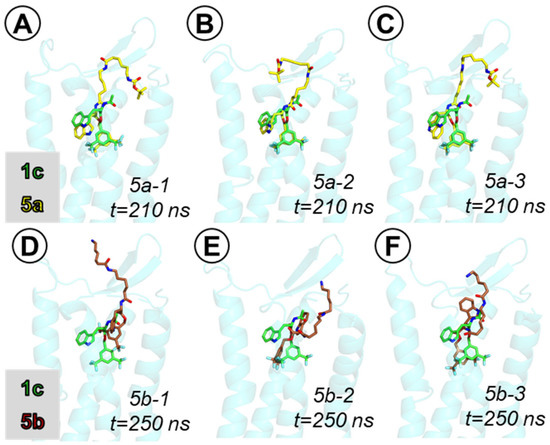 Another point of interest (with implications for further SAR work) was also the binding mode of the potent long analogues. We studied this problem by the examples of compounds 5a and 5b. Docking of these compounds yielded binding poses in which the core fragment is located, as in the case of the parent 1c, while the linkers are extended and interact with the residues of ECL2 or ECL1. For both compounds, docking finds a set of energetically close binding poses. This picture is somehow corroborated by the MD simulations. Each of the three production runs for 5a (3 × 210 ns) and 5b (3 × 250 ns) end with different binding poses (distinct from those found in docking).