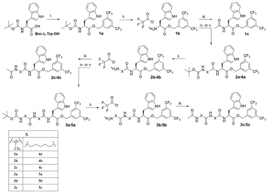 Synthesis of the designed analogues. Reagents and conditions: (i) caesium carbonate (Cs2CO3), 3,5-bis(trifluoromethyl)benzyl bromide, RT, 18 h, acetonitrile (ACN); (ii) trifluoroacetic acid (TFA): dichloromethane (DCM) (1:1), RT, 1h; (iii) acetic anhydride (Ac2O), N,N,N′,N′-tetramethylguanidine (TMG), 0 °C–RT, 1,5 h, dimethylformamide (DMF); (iv) 6-(N-(tert-butyloxycarbonyl)-amino)hexanoic acid N-succinimidyl ester (Boc-6-Ahx-OSu), TMG, RT, 6 h, DMF; (v) N-hydroxysuccinimide (HOSu), DCC, N-(tert-butyloxycarbonyl)-D-alanine (Boc-D-Ala-OH), TMG, 0 C- RT, 2 days, DMF.