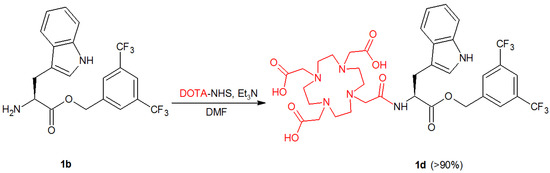 An exemplary synthetic route of conjugation reaction of DOTA-NHS with 1b. Other N-deacetylated derivatives of L-732,138, 2b–5b, follow conjugation reaction in a similar manner.