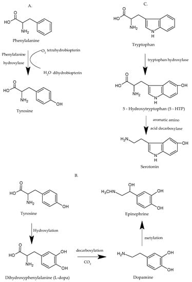 Biosynthesis of amino acids in the human body: (A) Phe adapted from [62]; (B) Tyr adapted from [67]; and (C) Trypt adapted from [68].