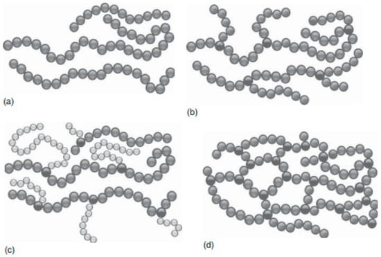 Types of polymers with various strand topologies: (a) linear polymer, (b) branched polymer, (c) graft polymer, and (d) reticulated polymer. Reprinted with permission from [91].