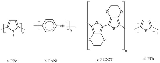 The most frequently used conductor polymers: (a) PPy, (b) PANI, (c) PEDOT, and (d) PTs. Adapted from [95].